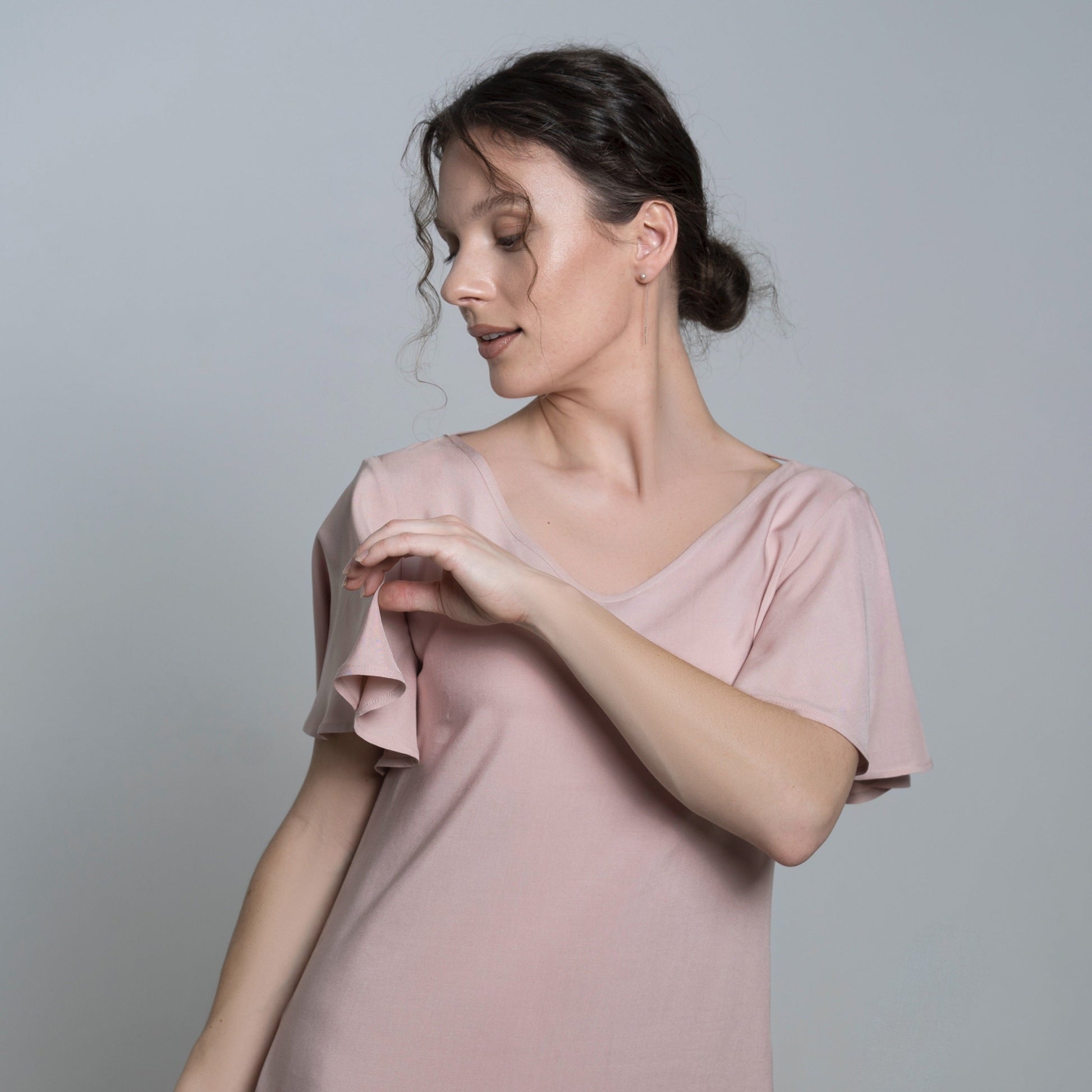 CLARA Bamboo Dress – Soft Pink | Flutter Sleeve, Open Back, Pockets